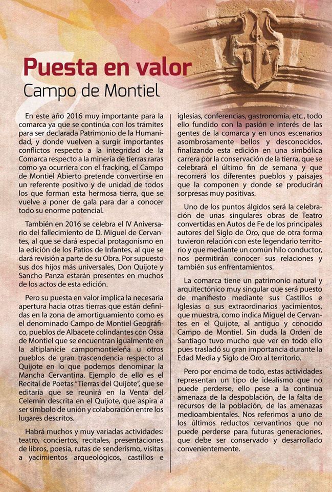 En este año 2016 muy importante para la comarca ya que se continúa con los trámites para ser declarada Patrimonio de la Humanidad, y donde vuelven a surgir importantes conflictos respecto a la integridad de la Comarca respecto a la minería de tierras raras como ya ocurriera con el fracking, el Campo de Montiel Abierto pretende convertirse en un referente positivo y de unidad de todos los que forman esta hermosa tierra, que se vuelve a poner de gala para dar a conocer todo su enorme potencial.