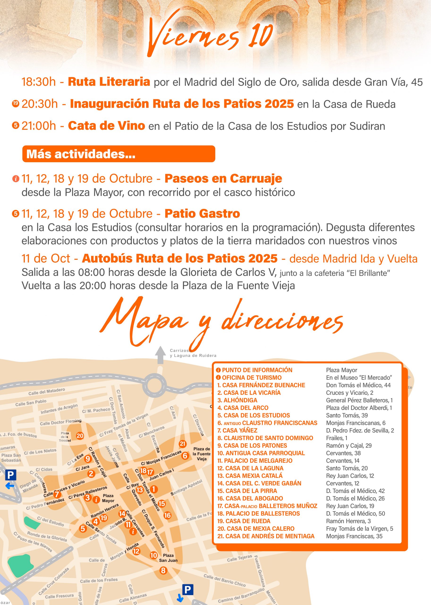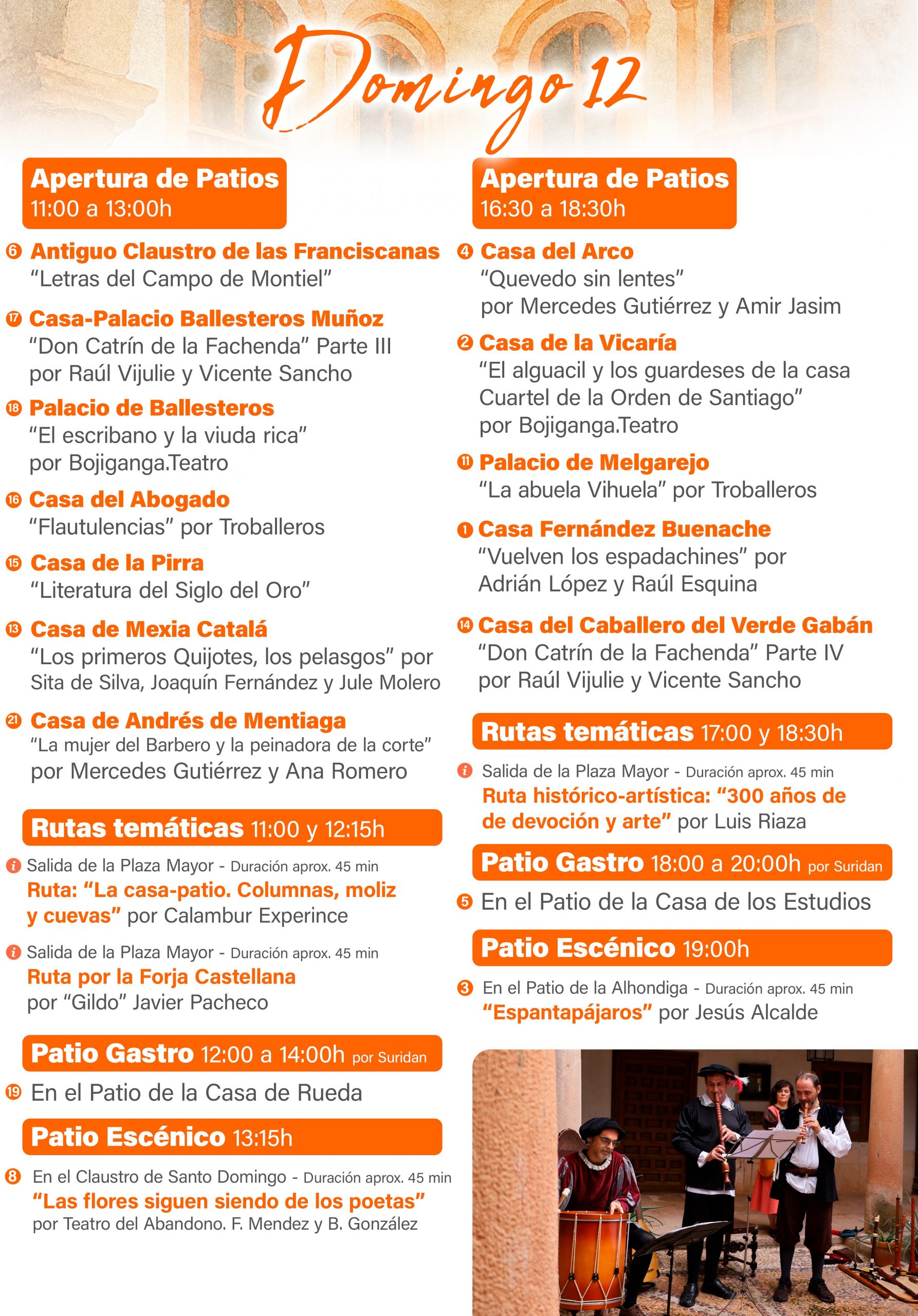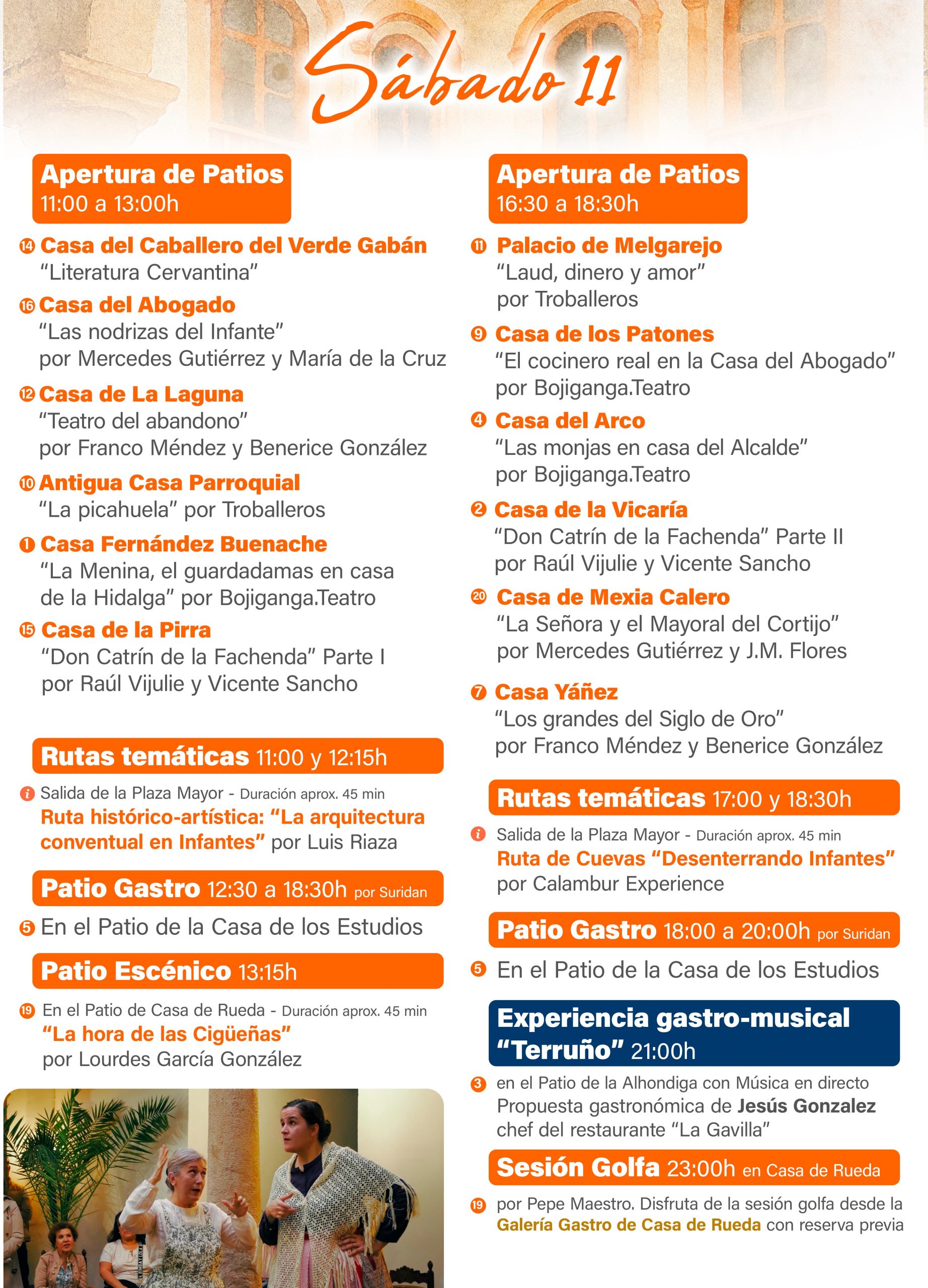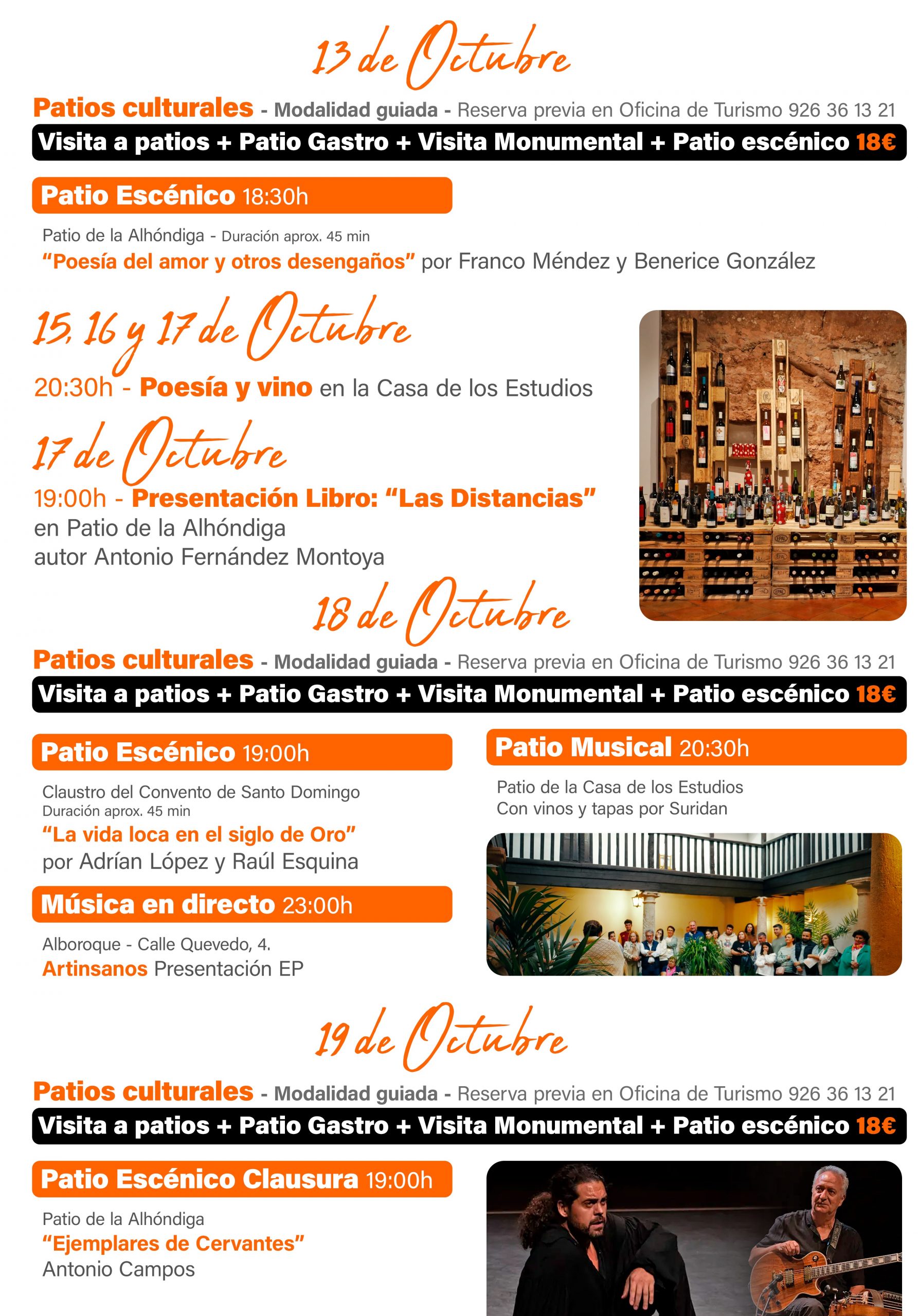 Este año, se desarrollará desde el 11 hasta el 19 de octubre con un programa repleto de actividades pensadas para disfrutar del singular patrimonio de Villanueva de los Infantes que incluye visitas a patios, rutas guiadas, representaciones teatrales, recitales de poesía, música en directo, degustaciones gastronómicas, y otras propuestas como la Experiencia Terruño, los Paseos en Carruaje o las Sesiones Golfas.